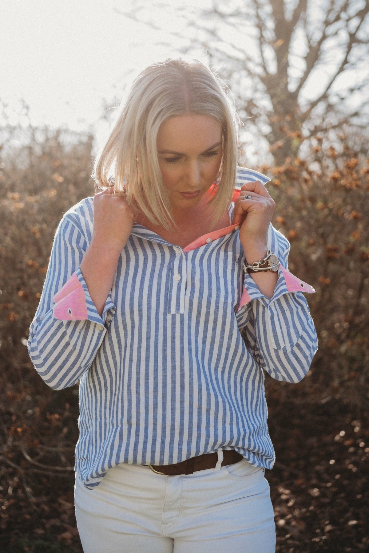 Blue and white stripes keep it classic, while the peach contrast trim on the collar base, placket, and cuffs adds that special finishing touch.