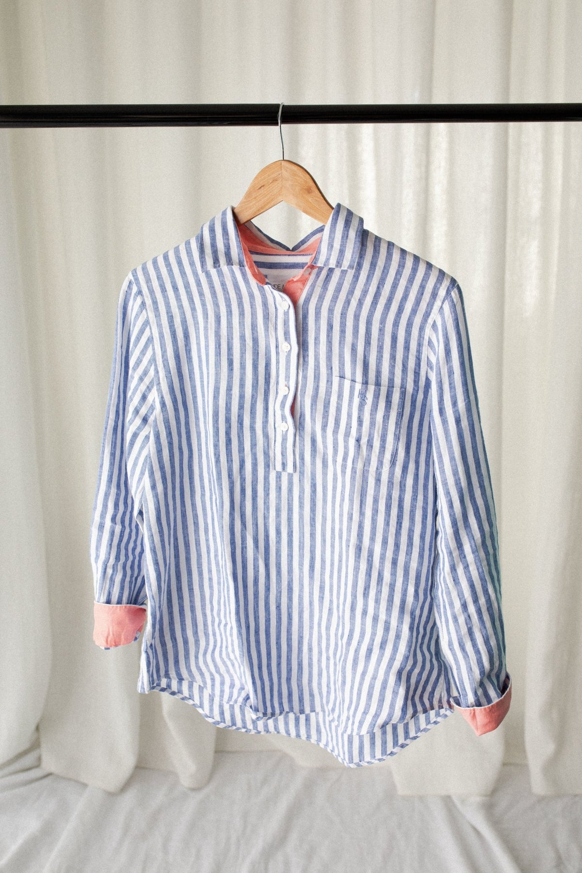 Where classic blue and white stripes meet effortless everyday dressing. Crafted from 100% linen, this shirt is light, breathable, and easy to wear, with a flattering fit. Finished with a soft peach contrast on the collar base, placket, and cuffs, it brings a fresh pop of colour to a timeless style.