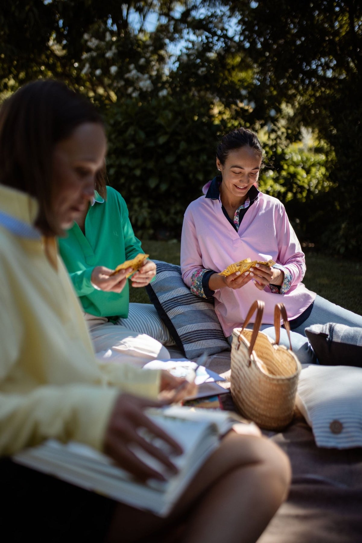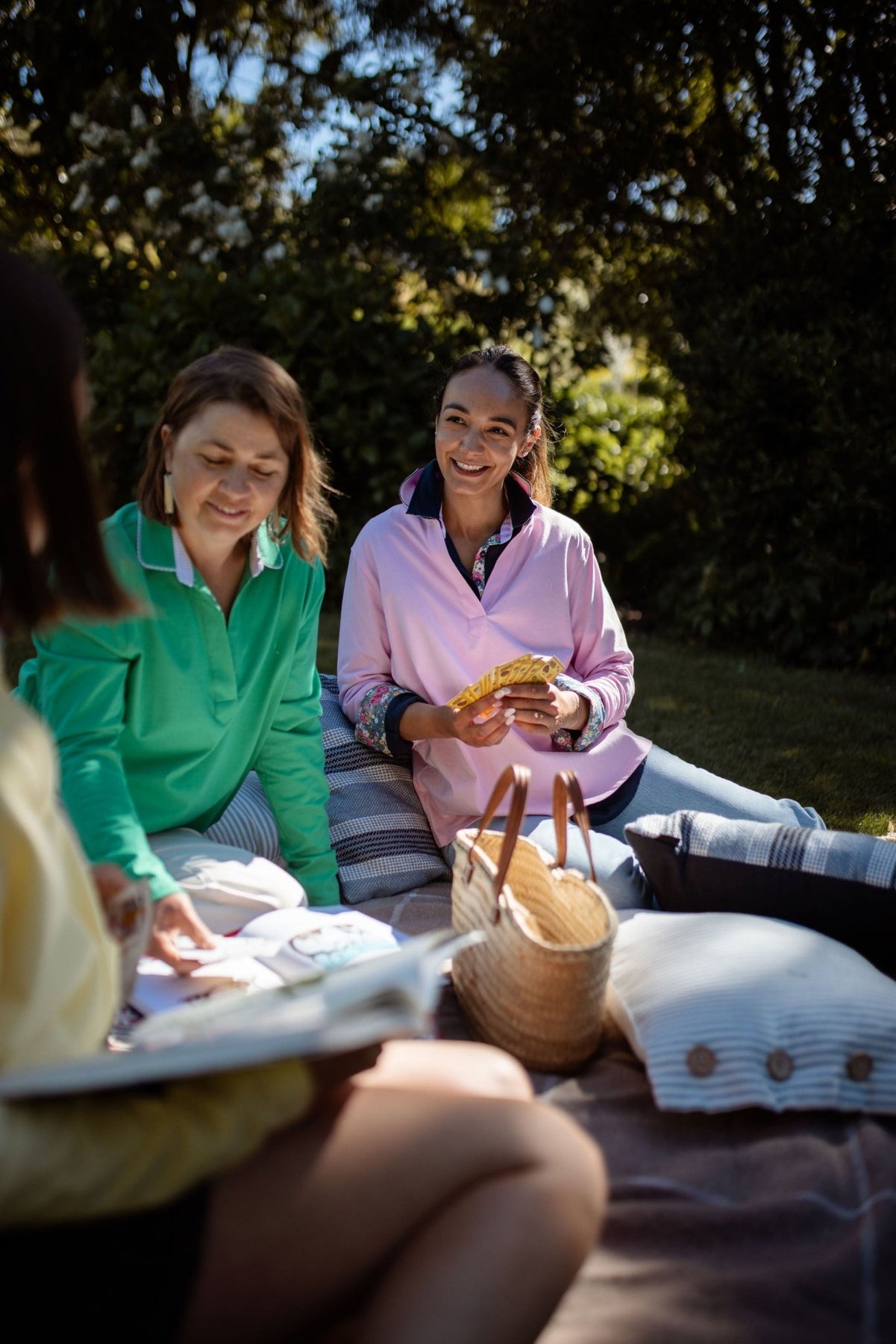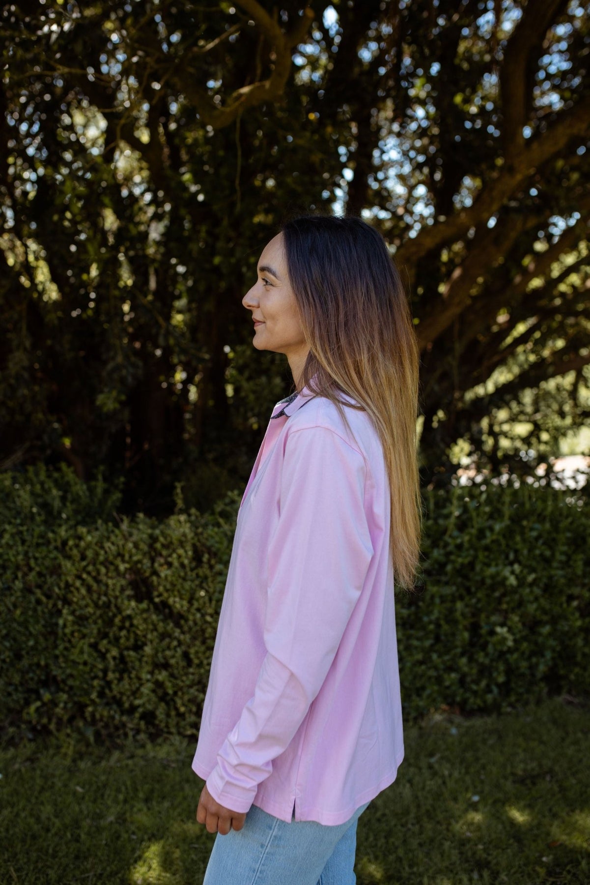 Pretty, easy and endlessly wearable, this light pink version of the Cate polo brings a gentle pop of colour to busy days. The cotton jersey gives it a smooth, relaxed feel that’s closer to your favourite tee, while still looking tidy enough for school runs, town trips or a quick catch-up over coffee. Inside the collar, a navy floral print adds a beautiful little touch that feels special without trying too hard.