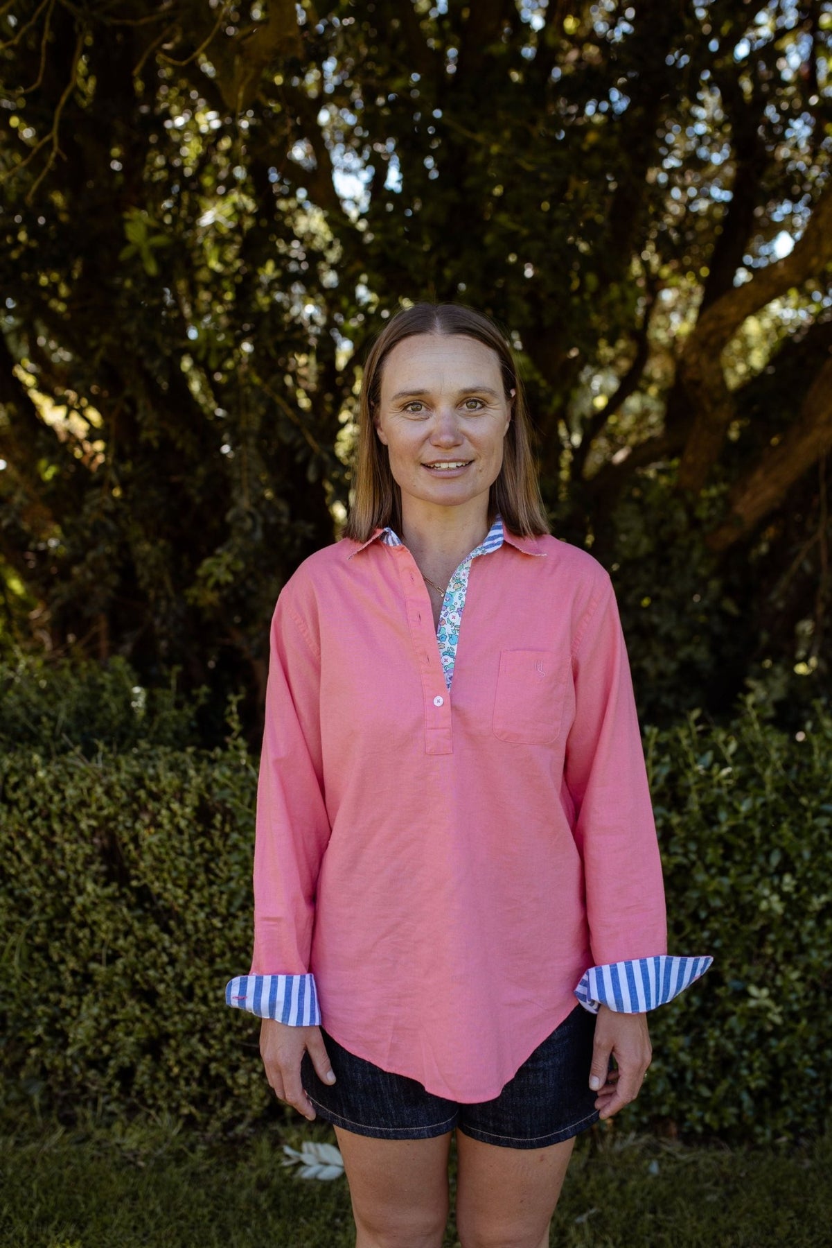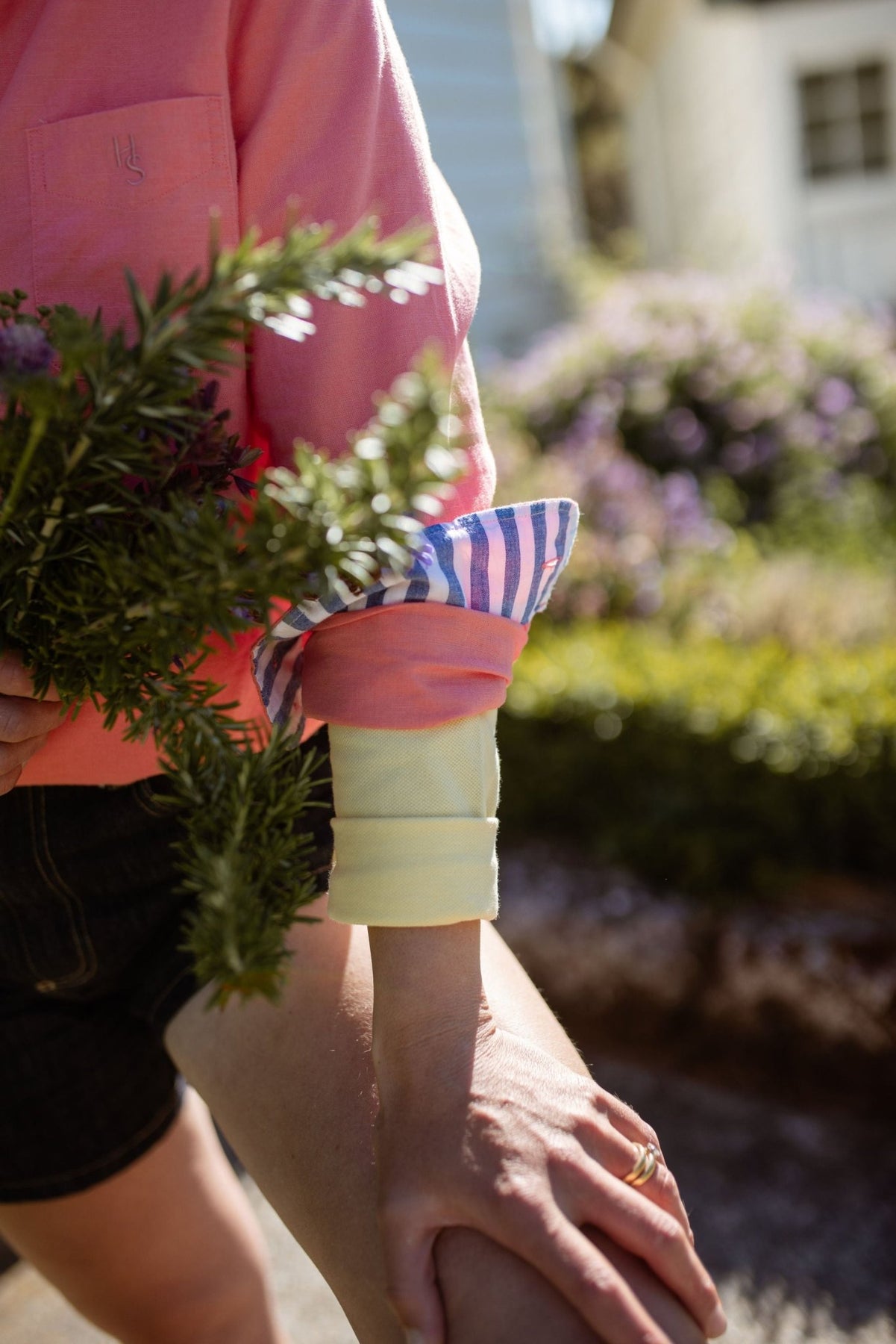 Crafted from a soft linen cotton blend, the Lou brings together comfort, breathability, and timeless style. The coral hue adds warmth and vibrancy, while the floral and striped contrast detailing under the collar, placket, and cuffs gives it that unmistakable H&S finish.