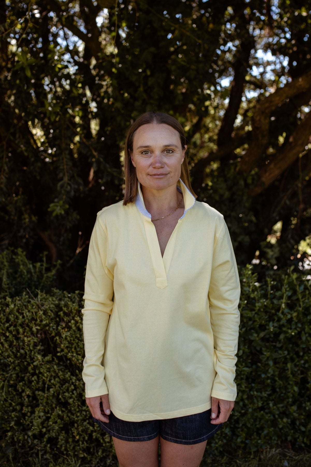 Easy, bright and beautifully understated, our Harriet Polo in Butter brings a soft pop of colour to your everyday wardrobe. Made from smooth, breathable 100% cotton pique, it balances comfort with a clean, refined shape. The open V neck placket keeps things relaxed, while the striped contrast inside the collar adds that signature H&S touch - subtle, thoughtful and unmistakably you.