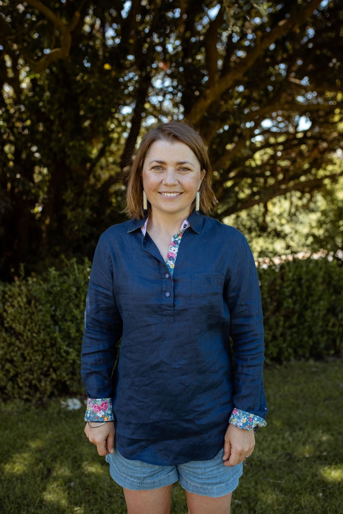 Crafted from a breathable linen cotton blend, the Molly is made for those in-between days where comfort meets polish. The rich navy base gives it timeless appeal, while the pink stripe and floral contrast inside the collar and placket add a signature H&S touch that lifts the look from simple to special.