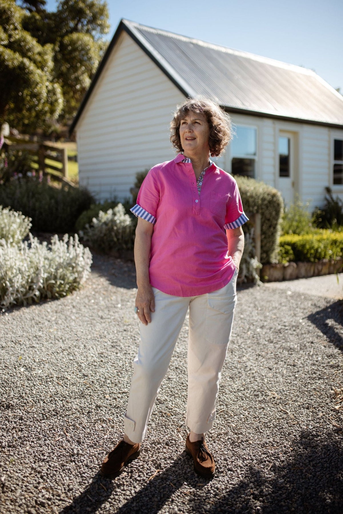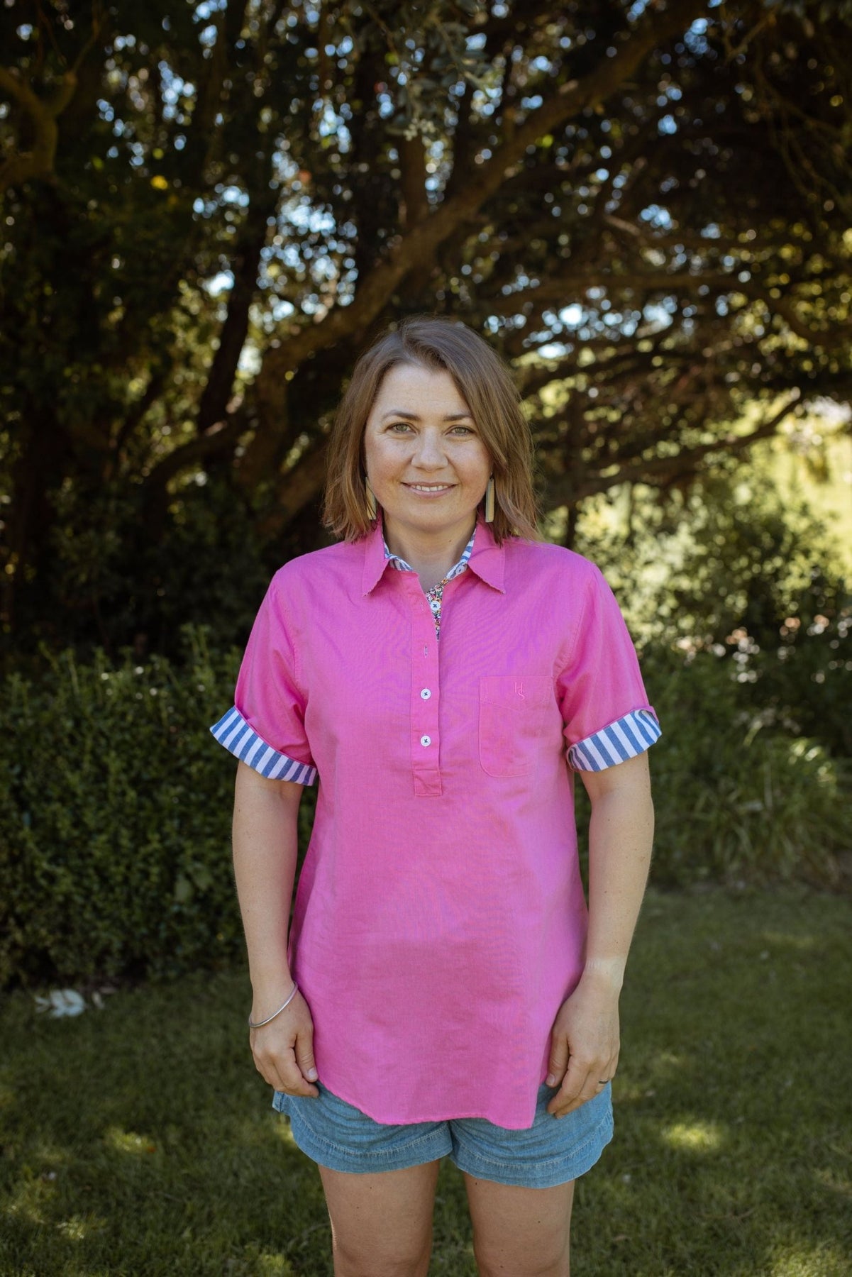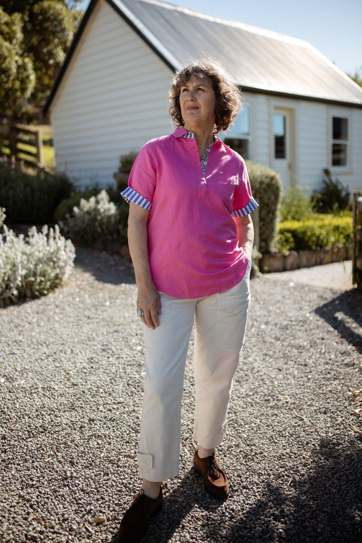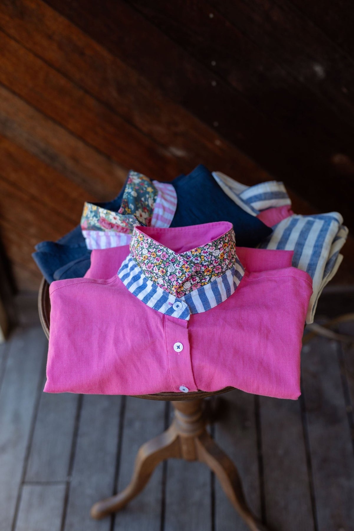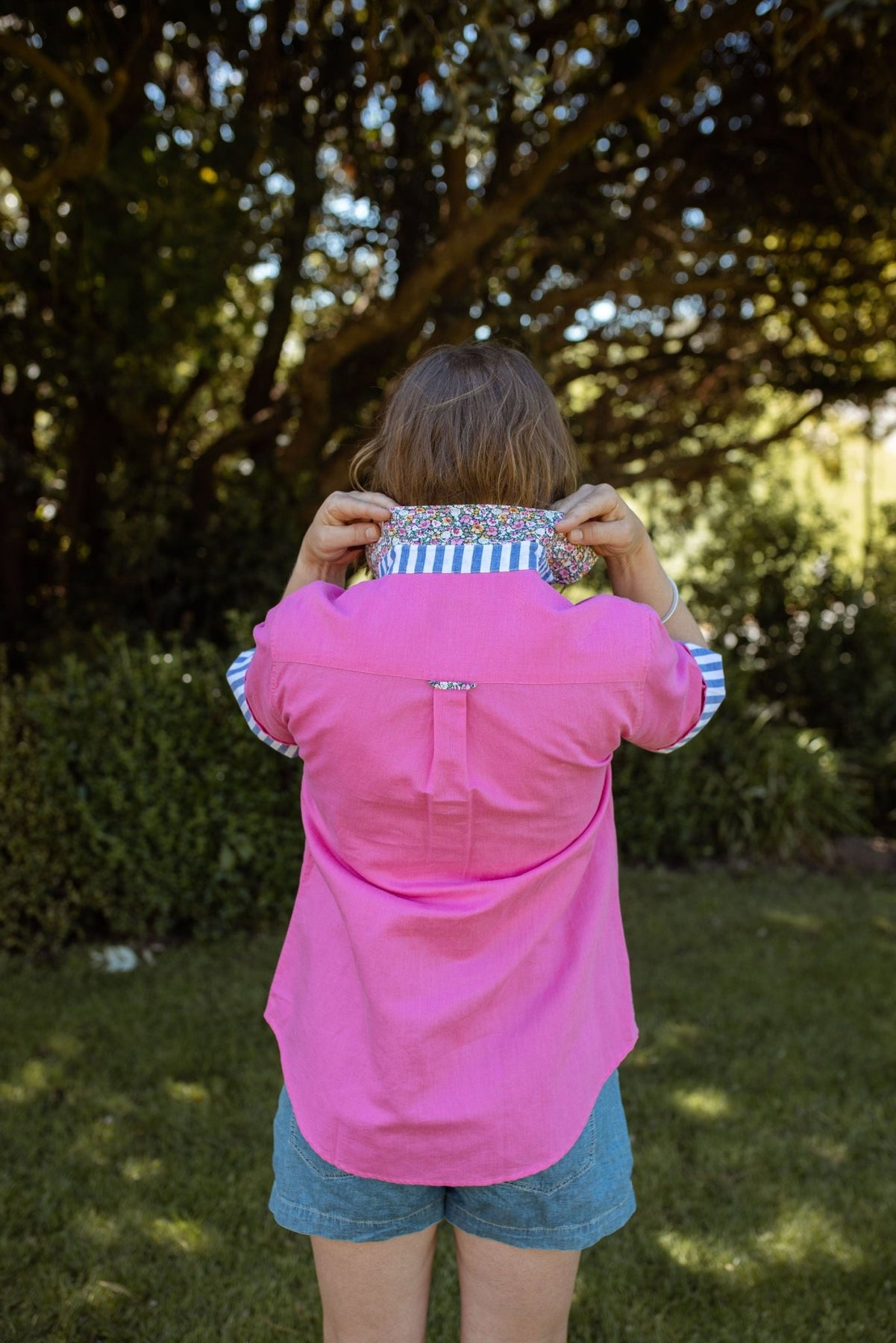 Crafted from a soft linen cotton blend, the Willa is light, breathable, and designed for days when you want comfort with a touch of colour. The vibrant pink body brings cheerful energy, while the blue and white striped contrast inside the collar and sleeves adds a classic H&S twist.